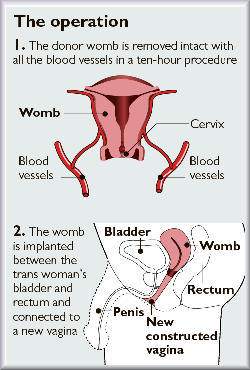 The diagram above shows the result of a theoretical uterus transplant procedure for a trans-woman. The transplant includes the cuff of the donors vagina, which is shown connected to a neo-vaginal canal probably constructed from penile skin and tissue - this is very useful for access to the uterus and clearing hormone induced menstrual flows. Obviously there are no ovaries and the uterine tubes have been truncated. After surgery there would be a c.12 week recovery period and the patient would require immunosuppressant drugs so that her body wouldn’t reject the new organ. The patient may need to wait a year before doctors will risk transplanting embryos into the new uterus, carefully prepared with hormones. If all goes well, the patient will become pregnant and carry her baby to term, for birth by C-section.