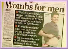 Pragmatically, whilst the biggest medical challenges related to uterus transpants have been largely overcome for cisgender women, the reality is that transgender women do have anatomical and endocrinological differences which increase the risk and complexity of an already very difficult procedure. Governing boards have a huge reluctance for their institution to become the first to facilitate the gestation and birth of a baby by a transgender woman. Whilst the legal, ethical and medical obstacles are often cited, I suspect that the real issue is a belief that the resulting publicity would be largely negative, and damaging to both the organisation's reputation and its future funding. Overall, transwomen are now being strongly discouraged by the medical profession from even hoping that pregnancy is a real prospect for them. Nomenclature: There is currently (2020) intense pressure from LGBTI+ activists to avoid the use of words such as 'man' and 'woman' in a sexual and reproductive context. This campaign has had great success, for example the Australia National University’s Gender Institute Handbook suggests that the word 'mother' be replaced by 'gestational parent', and 'father' by 'non-birthing parent'. In the UK, the hugely influential charity Stonewall is requiring organisations (including schools and children's hospitals) to replace the words "boy" and "girl" with gender neutral terms such as "they". However, the first version of this article was written in 2001 using traditional nomenclature - which I'm very reluctant to change.