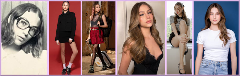 She had recently been discovered as a model and was being hailed by the likes of Vogue as "Fashions next big star". Instead she was forced to retire from modelling for a year. In 2019 she posted "I’m about to have my fifth surgery in two and a half years to correct more issues related to my SRS [but] in spite of everything, I’m glad that I had SRS" [Note: Articles and interviews about Maxim give her confusingly different ages, but the consensus seems to be that she was born on 15 April 1998.] Victoria Bazúa In 2024, the very young Mexican actress Victoria Bazúa (born 29 June 2008 as Victor) shot to fame after appearing in the Apple TV+ series Land of Women. With her attractive looks, slight frame (55 kg), modest but very leggy 5' 7" (170 cm) height (an inch more than when she tested for the role!), fun dress style and boyant personality she was a clear standout. In the first episode it is revealed that her character, Katie, was a lesbian, in the second - to the shock of many viewers - we discover that she is also a transgirl. In pre-release marketing the producers had revealed that Victoria was herself actually trans. In a subsequent interview Victoria says “When I expressed to my parents that I wanted to transition, that that’s who I was, I think I was two years old. I was like, ‘Mommy, I’m a girl.’" She was then always called Victoria and has no memory of her male name. By seven she had been totally accepted by her family as a girl, and she went to school wearing a girls uniform. When "the whole process of ... estrogen and hormones happened around 12, before puberty. I never really went through male puberty, I guess.” Victoria is often referred to as being post-GCS, but is silent about this - possibly because she had the procedure years before the legal minimum age of 18 that applies in many countries. Age 14 she was taken on by modelling agencies began working as a female model - initially for the locally based Queta Rojas, but the multi-national agency Paragon moved in when her potential became evident. She also started taking acting classes and age 15 - still physically growing as she completed her estrogen induced female puberty - she auditioned for the role of Katie, her first acting job. The producers had expected to fill the part with a twenty-something cis-woman actress who was convincing as a younger transwoman - but instead Victoria appeared from no where and was a perfect fit.